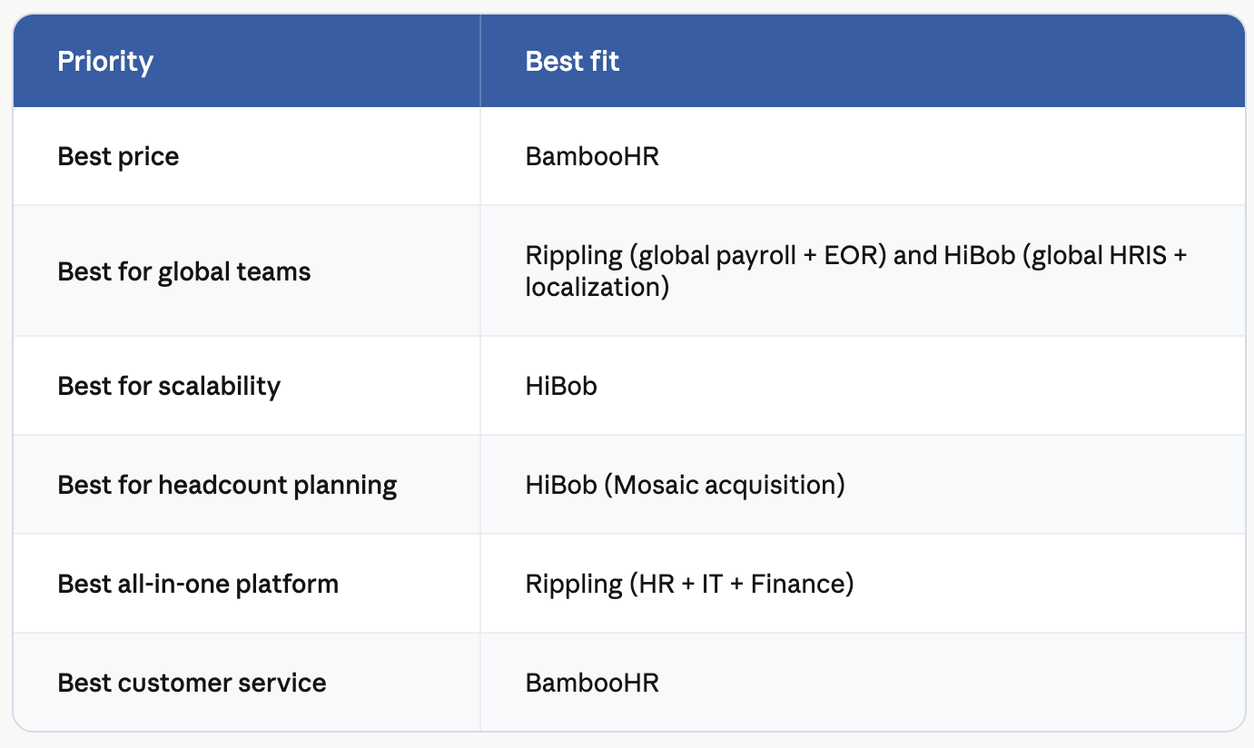 Edge: HiBob for the strongest global HRIS and localization. Rippling for global payroll breadth and EOR services. BambooHR for US-centric organizations with minimal international needs.