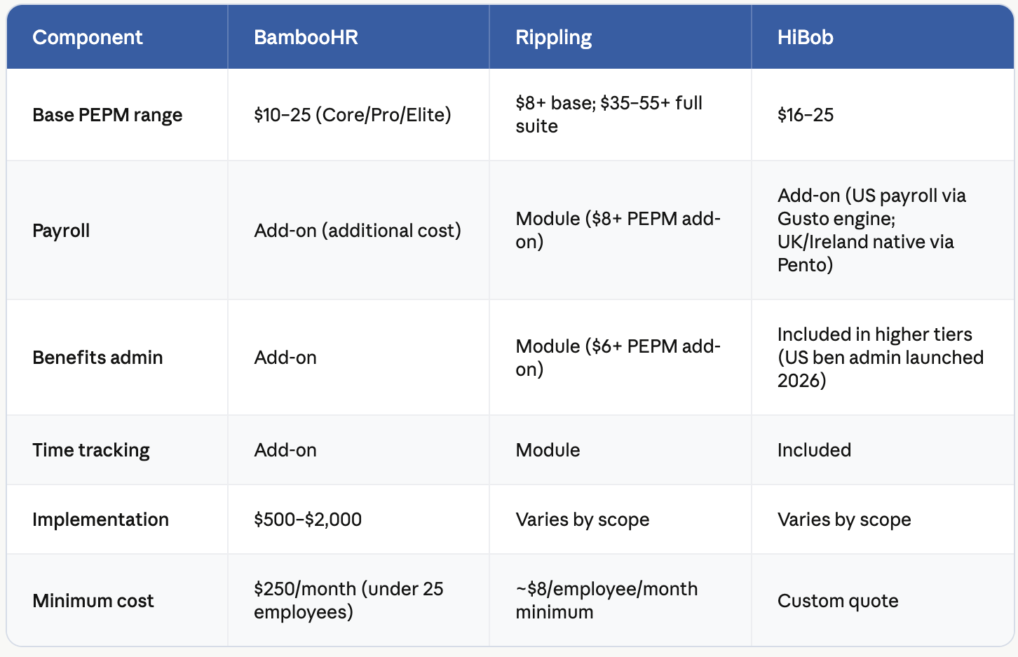 Rippling starts low at $8 per employee per month for the base HR module, but every capability beyond core HR — payroll, benefits, IT management, device management, spend management — is an additional module. A fully loaded Rippling deployment with payroll, benefits, time, and IT management can reach $35–55+ PEPM, making it the most expensive of the three when all modules are stacked.