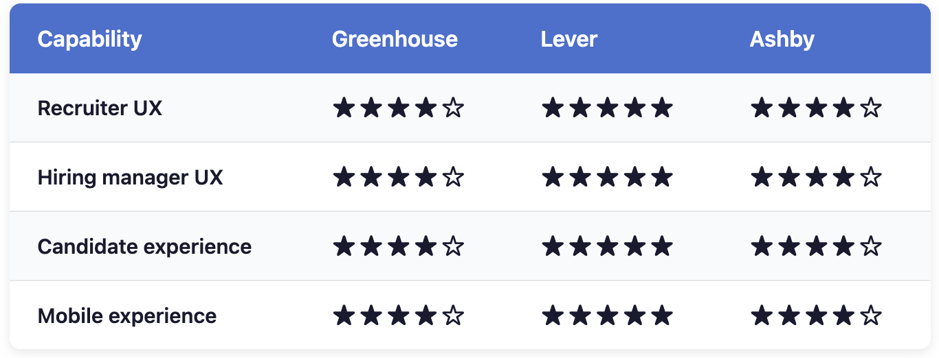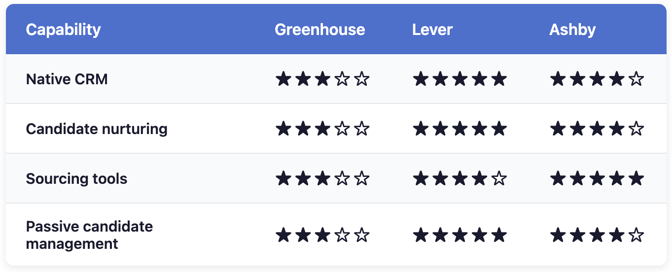 Verdict: Lever's native CRM is best-in-class for candidate relationship management. Ashby offers strong all-in-one sourcing. Greenhouse relies more on integration partners.