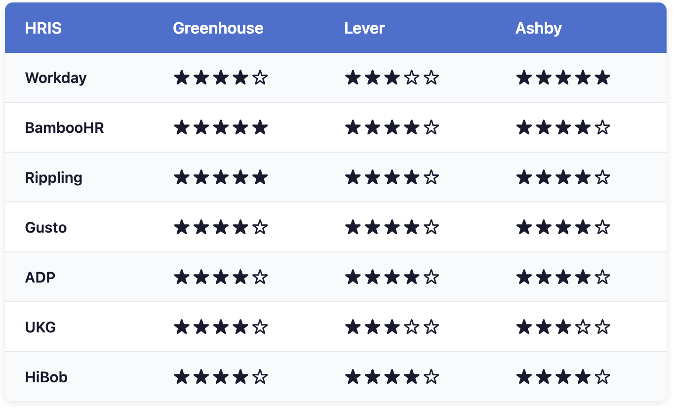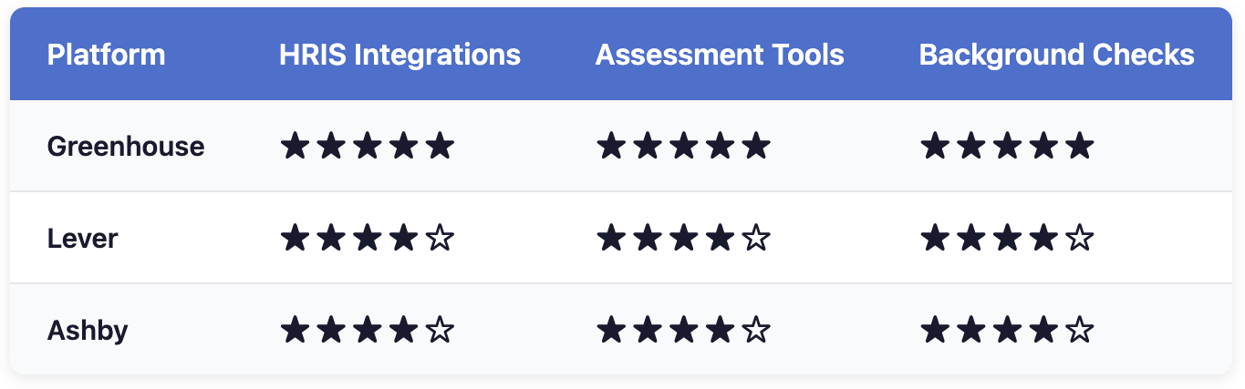 Verdict: Greenhouse's 400+ integration marketplace is the most extensive. Lever and Ashby offer solid integrations but with smaller ecosystems.