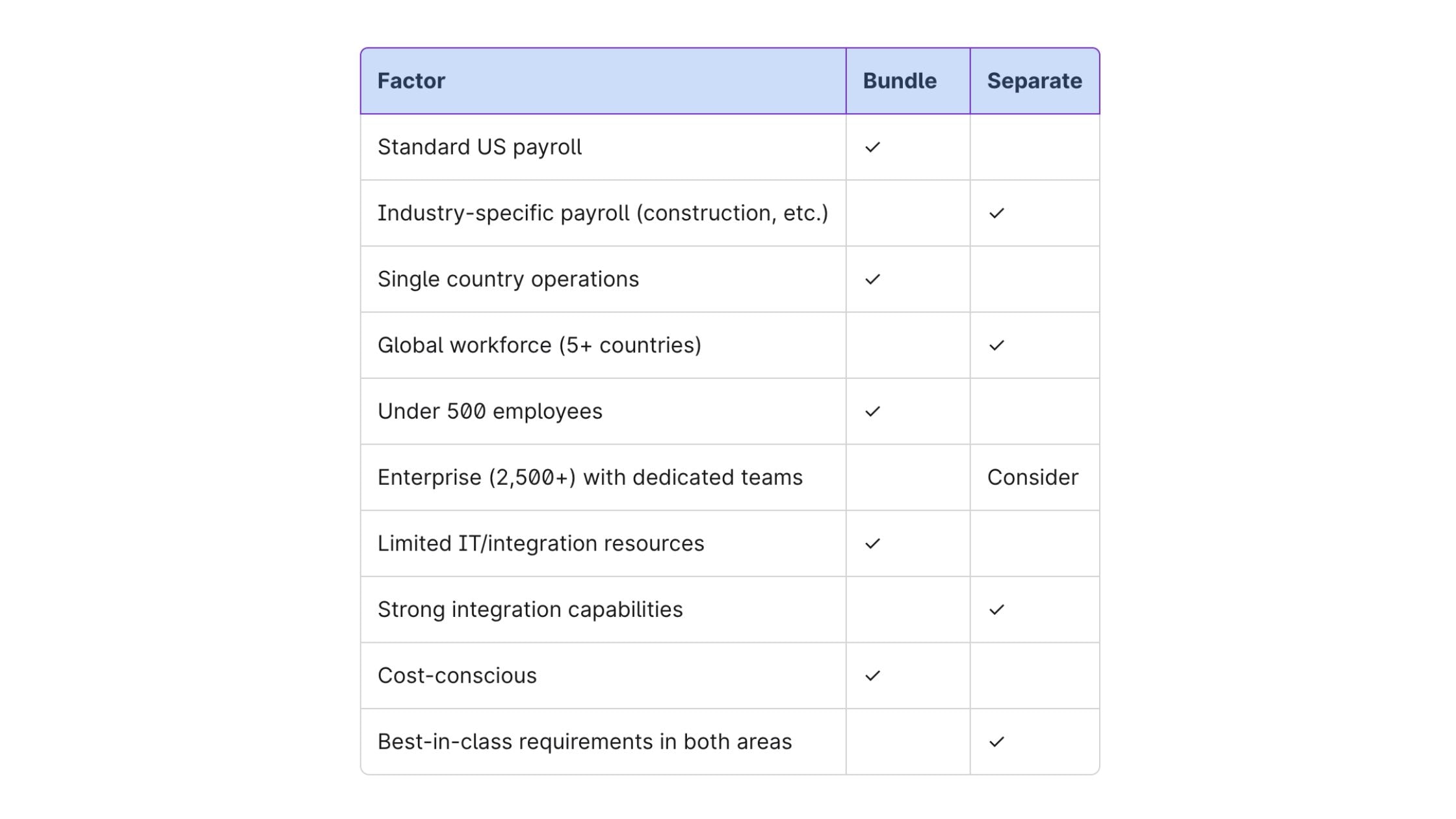 Mid-market companies (100-2,500 employees) rarely benefit from this approach. The overhead of managing separate systems typically outweighs any functional advantages. Unless you have a specific forcing function (industry complexity, global footprint), bundled HR and payroll software is almost always the right call.