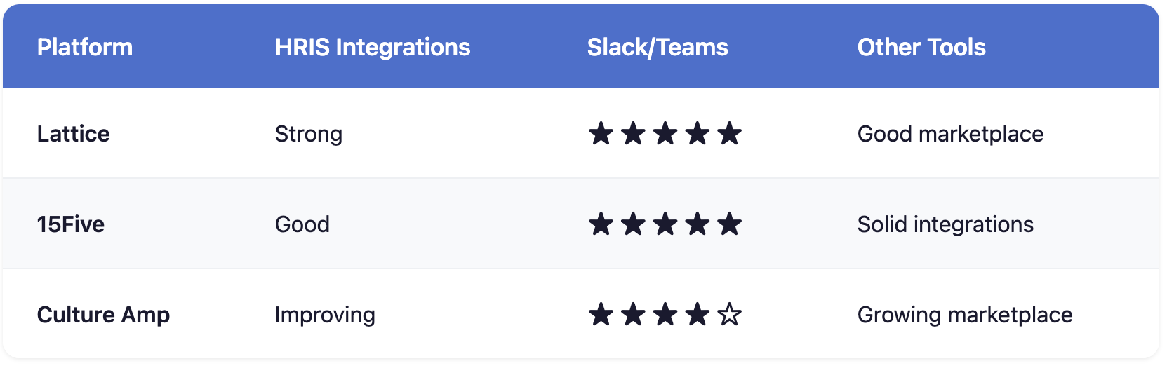Verdict: Lattice has the most mature integration ecosystem. Culture Amp was late to HRIS integrations but is catching up.