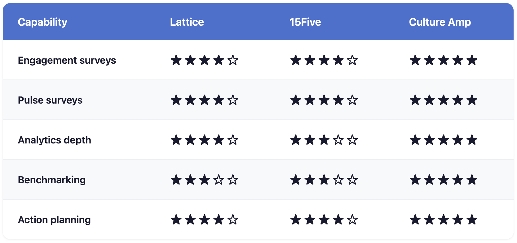 Verdict: Culture Amp dominates engagement surveys and analytics. It's their core competency. Lattice and 15Five offer good engagement features, but they're not the primary focus.