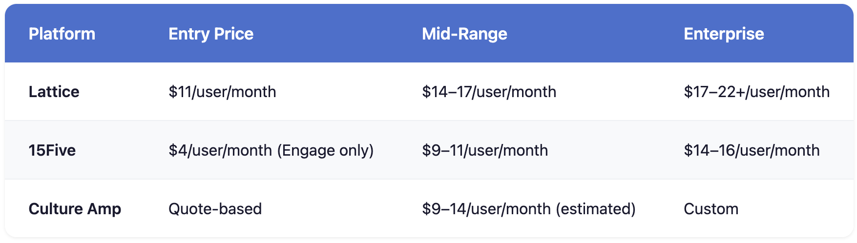 Verdict: 15Five offers the best value at the entry and mid-range levels. Lattice commands a premium for its breadth. Culture Amp pricing is opaque but generally competitive.