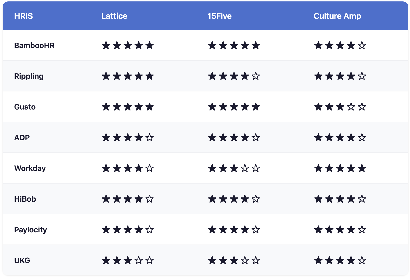 All three platforms integrate with major HRIS vendors, but compatibility varies: