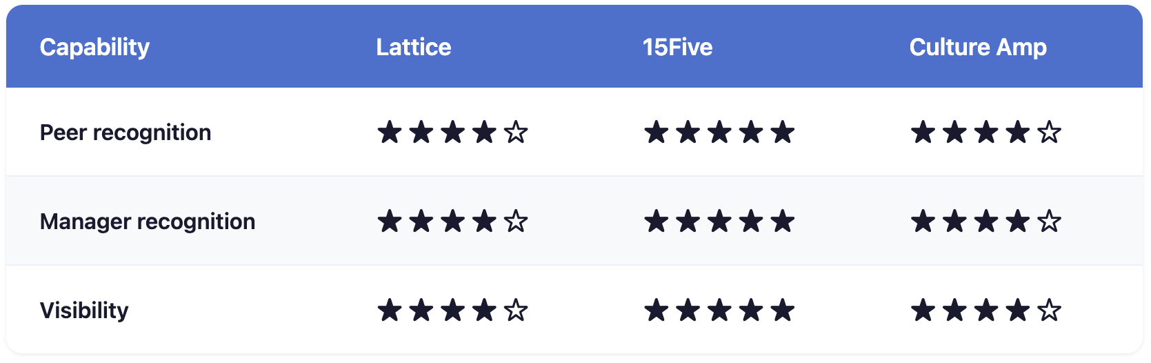 Verdict: 15Five's High Fives feature is the most developed recognition system. Lattice and Culture Amp offer recognition (shoutouts), but it's not their differentiator.
