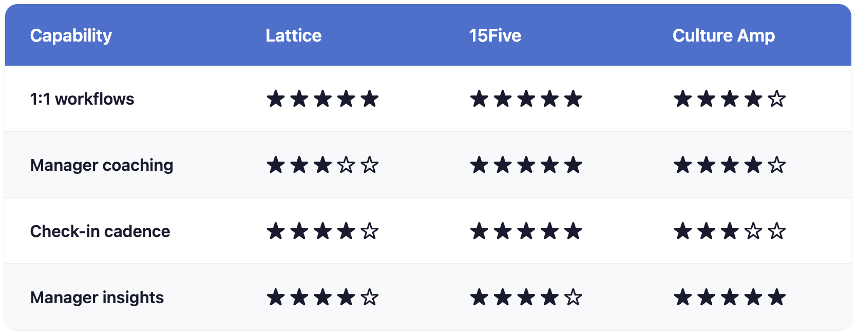 Verdict: 15Five wins for manager enablement and coaching. Their entire platform is designed to make managers more effective. Lattice provides strong 1:1 workflows. Culture Amp provides excellent manager-level analytics.